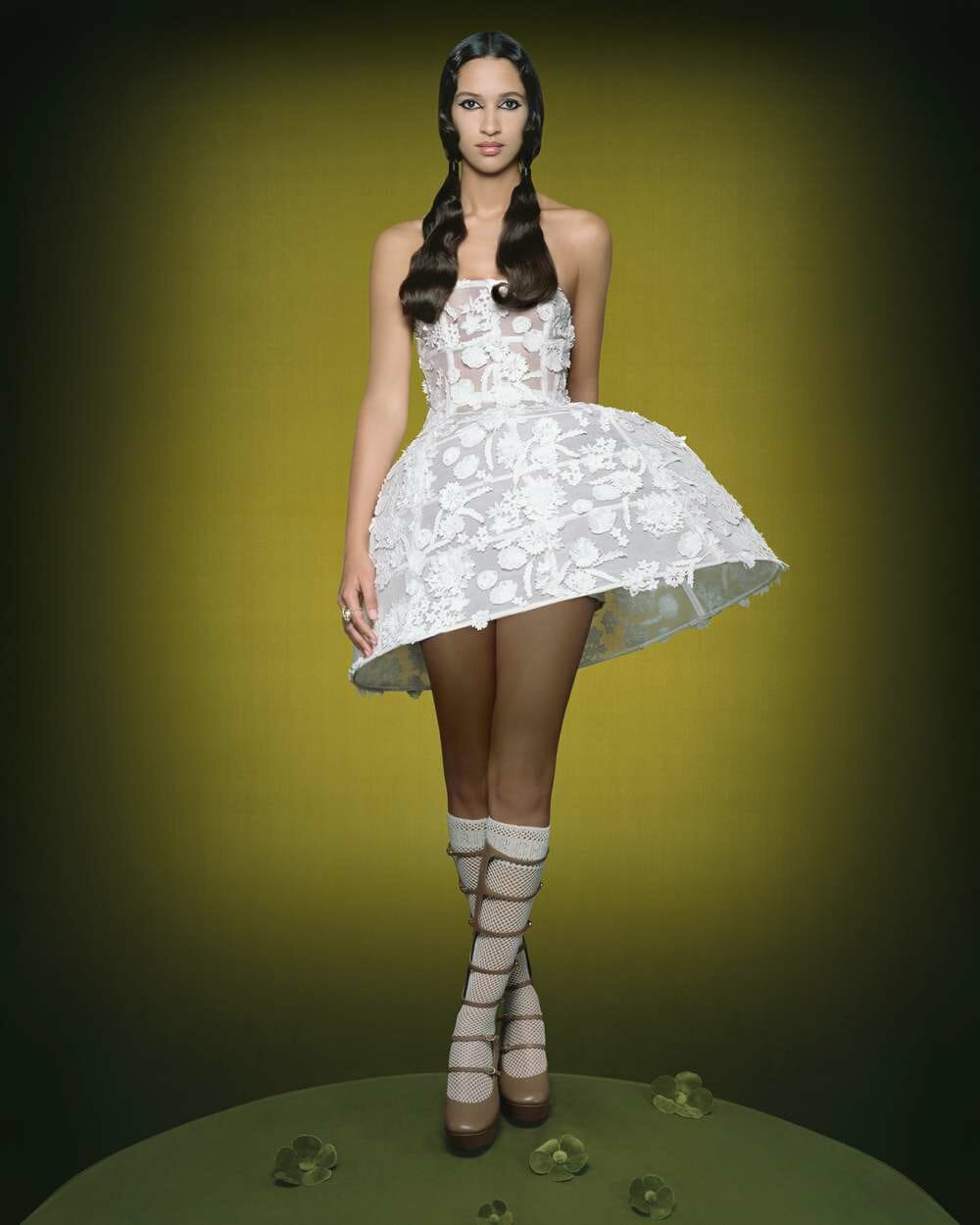 Antara cahaya dan teduh, dalam suasana halus yang diterangi oleh rona hijau, penampilan dalam kempen menceritakan kisah pertemuan simbolik antara Dior dan rekaan yang ikonik, seperti rupa baru korset, yang menyerlahkan siluet dengan garis grafiknya. Skirt crinoline dan gaun ditafsir semula dalam perkadaran yang berlanjut, dengan perincian kesukanan meningkatkan dialog antara masa lalu dan sekarang.