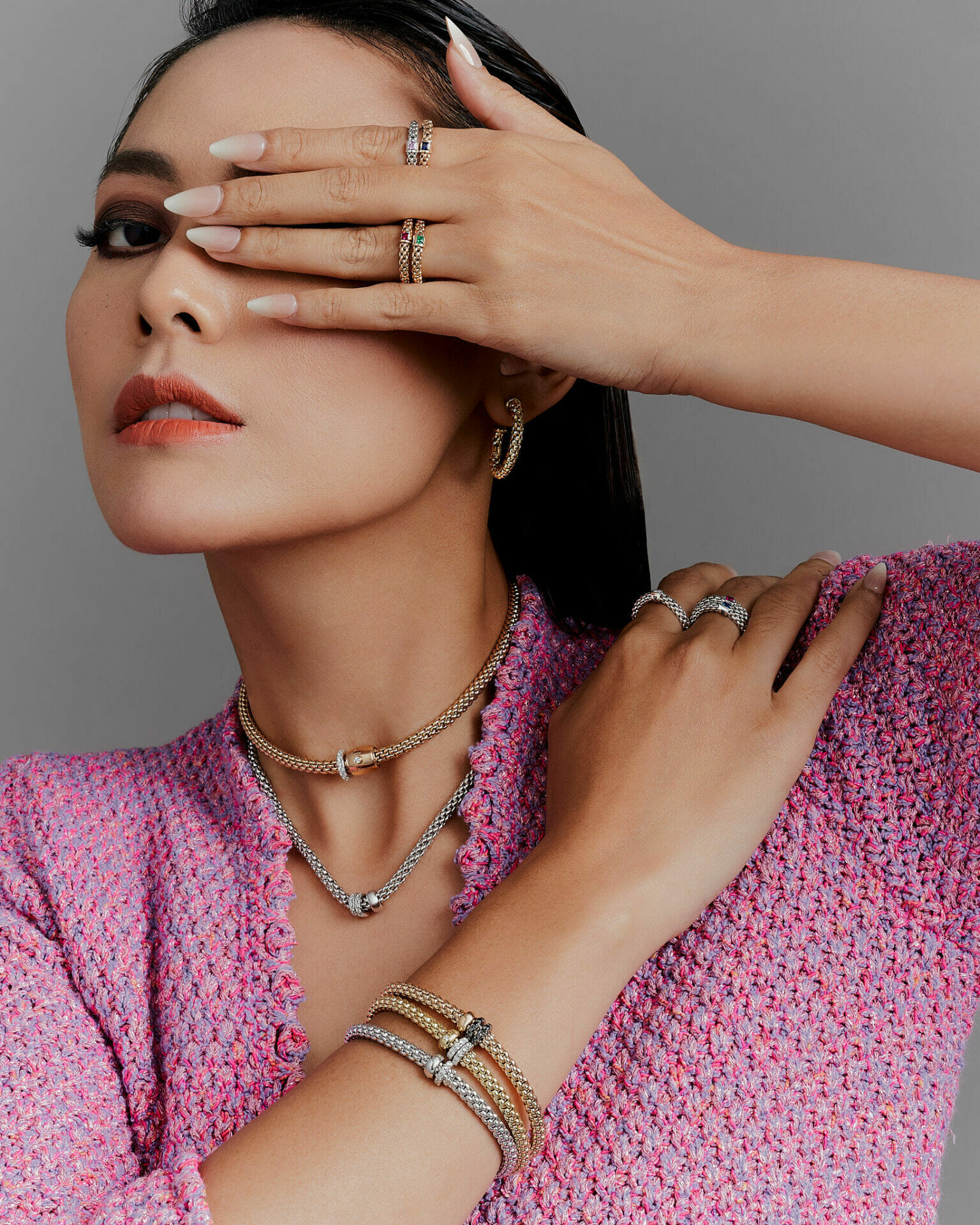 Whulandary menyarung The Souls Collection Flex’it rings, The Essentials Collection 18 karat gold hoops earrings, The Solo Collection Flex’it necklace with ornamental clasp and diamond pavé, The Solo Collection Flex’it bracelet with three rondels and diamond pavé, The Solo Collection Flex’it bracelet with three rondels and black diamond pavé, The Solo Collection Flex’it bracelet with double rondels and diamond pavé.