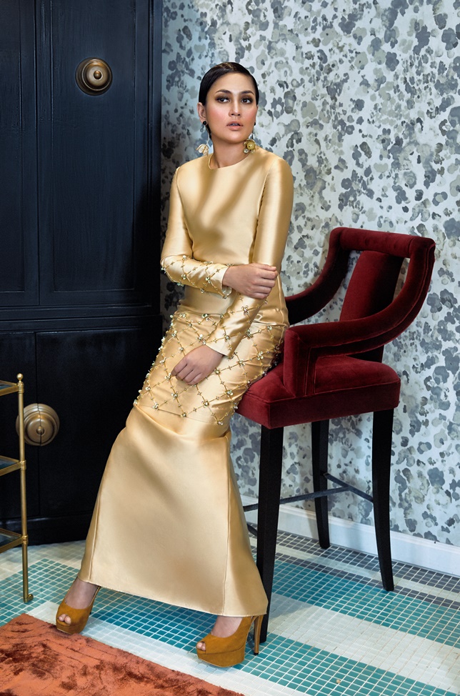 Hasilnya sudah tentu memukau! Gaun rona kuning dengan leretan kain panjang itu menggunakan organza sutera serta dihiasi corak bunga. Jelas Powell, “Cinderella memenangi hati putera dek kerana kebaikannya. Oleh itu saya mahu tonjolkan sisi itu melalui busana yang dipakai olehnya. Saya mahu dia kekal sederhana dan suci walau bakal bergelar diraja.”