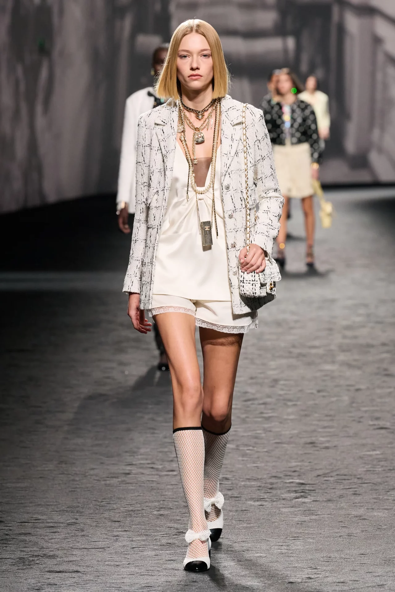 Virginie Viard kembali ke minggu fesyen Paris dengan koleksi musim bunga/panas 2023 untuk Chanel. Reben bow, sepatu but berkilau dan jemaki mencuri perhatian, mengambil inspirasi secara halus dari filem Last Year in Marienbad karya Alain Resnais.