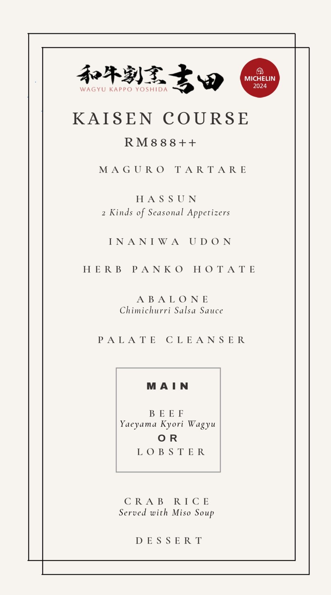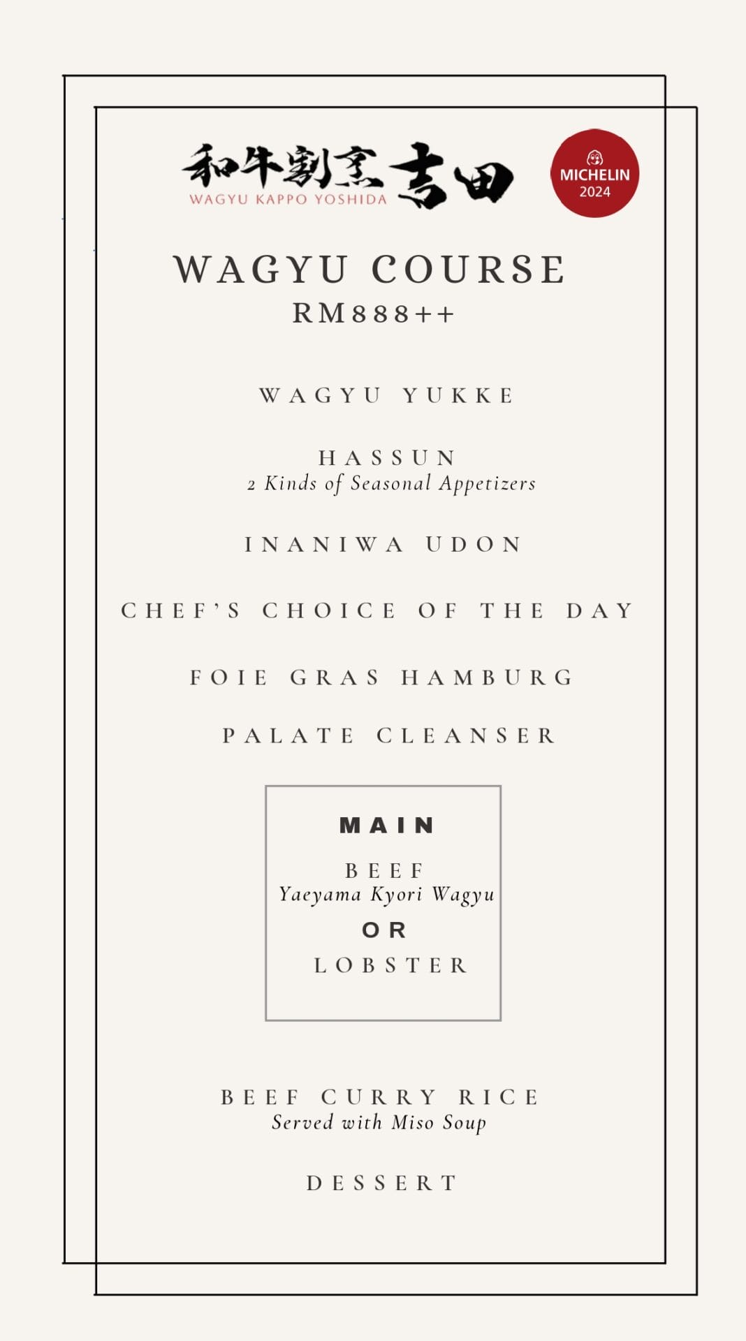 Diketuai oleh Chef Junichi Yoshida yang bertaraf Michelin, Wagyu Kappo Yoshida menyajikan pengalaman Beef Omakase yang mewah. Restoran ini menampilkan Wagyu berkualiti tinggi yang diimport dari Jepun. Terletak di tingkat 48 Menara Naza, restoran eksklusif dan intim ini menawarkan pengunjung satu pengembaraan kulinari yang tidak terlupakan dengan Wagyu Jepun terbaik di Kuala Lumpur.