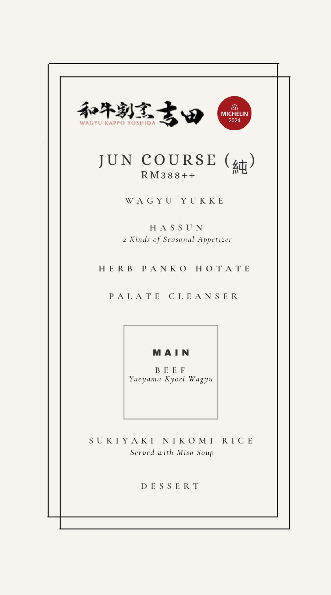GLAM berkesempatan menikmati set hidangan Jun, yang menyajikan menu lazat dan eksklusif dari pembuka selera hingga pencuci mulut. Antara hidangan yang disajikan, pilihan utama GLAM ialah Yaeyama Kyori Wagyu. Daging wagyu ini benar-benar memenuhi jangkaan, dimasak dengan sempurna dengan bahagian luarnya yang rangup, sementara daging di dalamnya kekal lembut dan berjus.