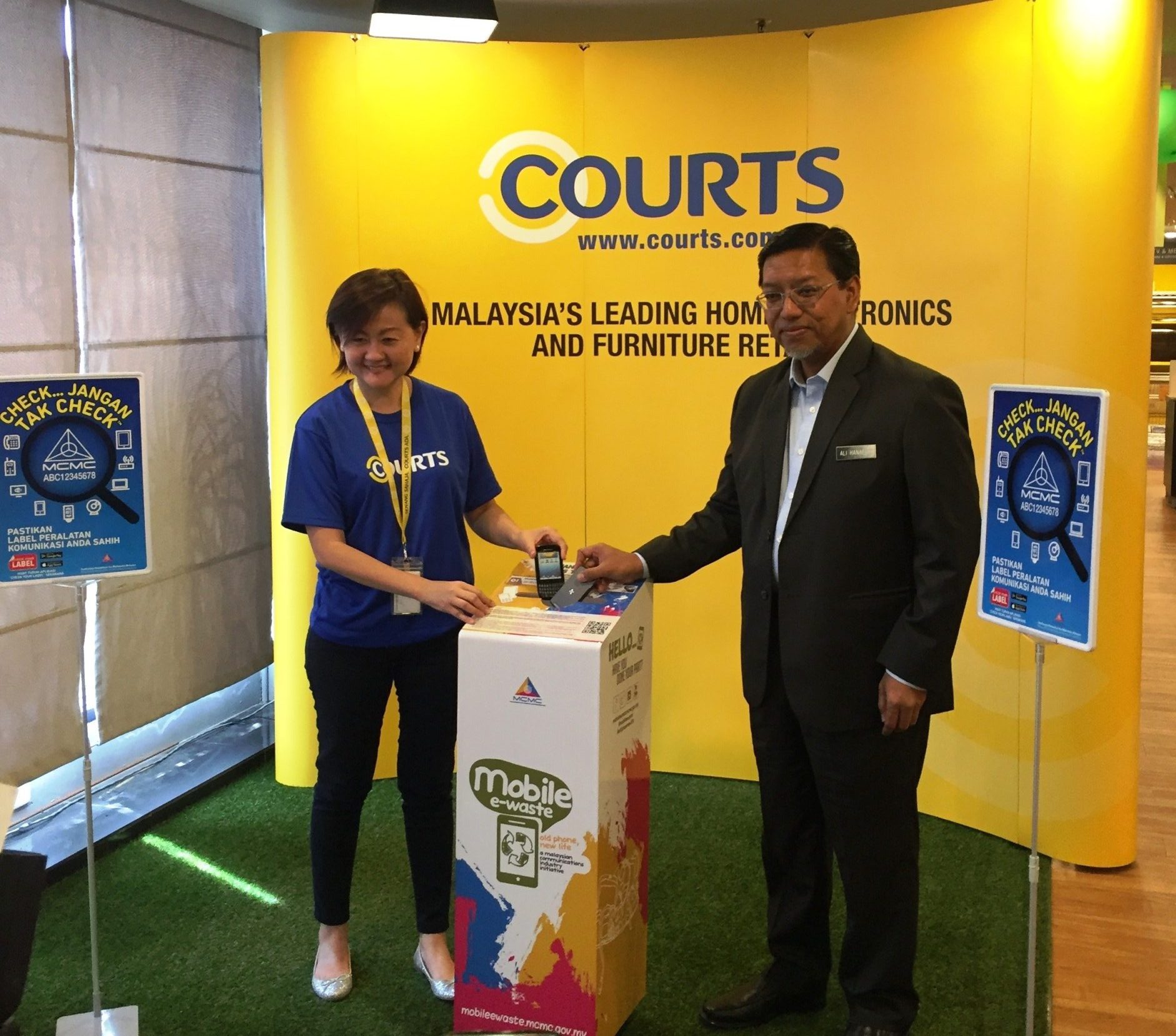 Low Bee Yin, Pengarah Pemasaran dan Dato’ Mohd Ali Hanafiah Mohd Hanafiah, Ketua Pegawai SKMM melancarkan tong pelupusan peranti digital di Courts.